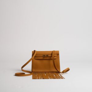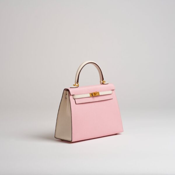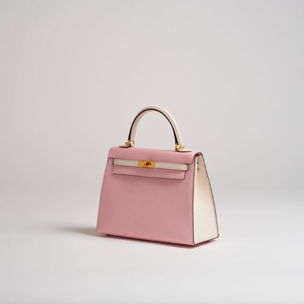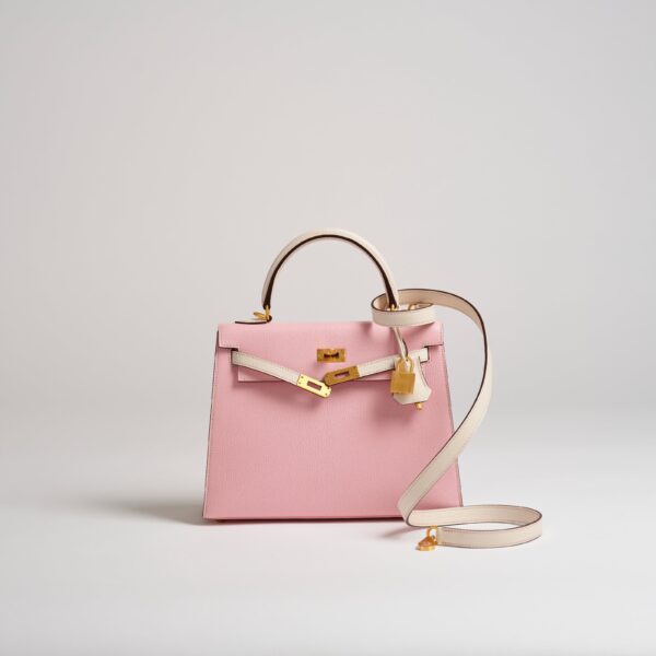 This stunning Hermès Horseshoe Kelly is highly coveted in a soft candy tone bi colour combination. Brushed gold hardware is always the perfect finish to any bespoke order Hermès handbag.