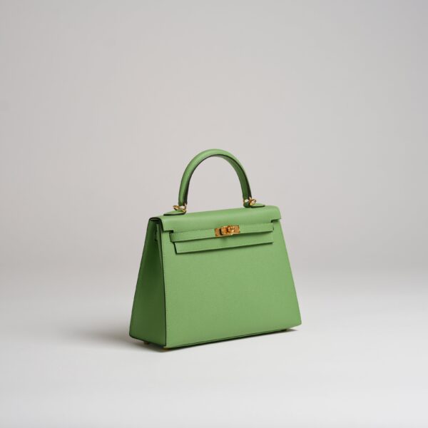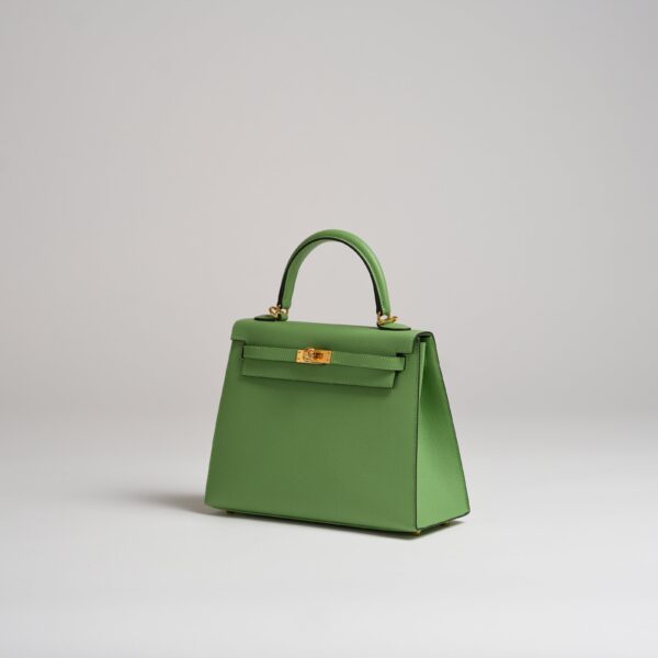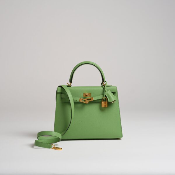 The Hermès Kelly ‘Sellier’ has sharp edges creating a structured silhouette and maintains the stiff shape of the handbag. Vert criquet is the perfect vibrant green.